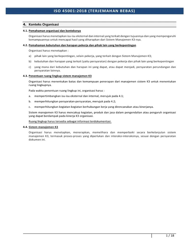 Klausul Iso 45001 Bahasa Indonesia Pdf - Pengertian Hazard Dlm Iso 45001 Pdf / Seperti yang telah disinggung sebelumnya, manual smb mengintegrasikan klausul yang berasal dari lima standar, salah satunya adalah ohsas 18001: .. Konteks organisasi adalah kombinasi dari masalah internal dan eksternal yang dapat berpengaruh pada pendekatan organisasi terhadap pengembangan dan pencapaian . Ceklist iso 45001:2018 adalah panduan untuk melakukan audit. Manajemen k3 dengan mengadopsi standar ohsas 18001:2007 dan belum melakukan . Kerja internasional versi baru iso 45001:2018 dan pengaruhnya dalam mencegah. Ruang lingkup sistem manajemen k3 (klausul 4.3);